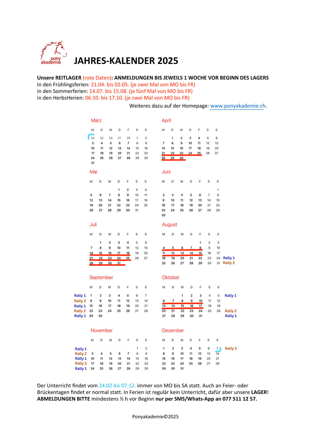 In der Ponyakademie wird ab der letzten Februarwoche bis in die erste Dezemberwoche geritten. Auch an Feiertagen wie Ostern, Auffahrt oder Pfingsten haben wir normalen